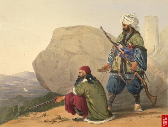 Keywords: Afghan foot soldiers in 1841.jpg Afghaun foot soldiers in their winter dress with entrance to the Valley of Urgundeh This lithograph was taken from plate 11 of 'Afghaunistan' by Lieutenant James Rattray During the severe winters Afghanis wore a shirt kameez under a leathern spencer or half-jacket which was embroidered in silk and had a wool lining Thick black cloth trousers fastened by a rope around the waist and bound with the same material from ankle to knee were also worn Amulets relics and little bags full of texts and prayers were tacked about their clothes This Burj watch-tower was one of many between the Maidan and Arghani valleys The British met with considerable resistance at such points on their advance from Kandahar to Kabul The resisting Afghans were spread along mountain posts and were commanded by two nephews of Dost Mohammed The men depicted here belonged to a British regiment called the Rangers which was raised in Kohistan under the command of Lieutenant Maule of the Artillery who said that he had his hands full trying to impose discipline among these wild unruly merry fellows Rattray himself left Kohistan in September 1841 but Maule his subaltern and European sergeants were murdered by their troops only two months later http //www bl uk/ The British Library 1841 Lieutenant James Rattray PD-Old PD-old-70 Men of Afghanistan in the 19th century Rattray Afghaun foot soldiers in their winter dress with entrance to the Valley of Urgundeh Men of Afghanistan in art Rattray Afghaun foot soldiers in their winter dress with entrance to the Valley of Urgundeh First Anglo-Afghan War Rattray Afghaun foot soldiers in their winter dress with entrance to the Valley of Urgundeh 1841 lithographs Rattray Afghaun foot soldiers in their winter dress with entrance to the Valley of Urgundeh Soldiers of Afghanistan Clothing of Afghanistan