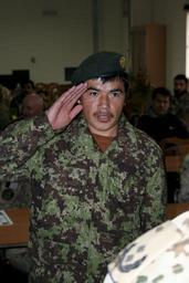 Keywords: Afghan Forces graduate from IED-Defeat-EOD training 111215-N-XY282-126.jpg en An Afghan National Army soldier salutes his leadership during a graduation ceremony held at the Afghan National Army Engineer School near Camp Spann Dec 15 Fifteen Afghan servicemen graduated in the ceremony and can now wear the Explosive Ordnance Disposal patch and badge after completing 22 weeks of intensive EOD and Improvised Explosive Device Defeat training The Engineer School is the only one in Afghanistan that teaches the fundamentals of EOD and IEDD to Afghan National Security Forces International Security Assistance Force Regional Command North supports Afghan National Security Forces in close coordination and collaboration in providing security and disrupting the insurgents' activities in order to protect the population secure the highways and support the Afghan Border Patrol operations in the border areas and crossing points in order to set the conditions for economic social and cultural development in key terrain districts 2011-12-15 Petty Officer 1st Class Richard Wolff https //www dvidshub net/image/501585 111215-N-XY282-126 2011-12-19 08 37 MAZAR-E-SHARIF AF PD-USGov-Military-Navy Soldiers of the Afghan National Army Images from DoD uploaded by Fæ |