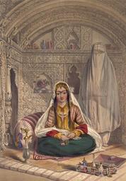 | Keywords: Afghan lady in Kabul.jpg en Ladies Of Caubul This lithograph is taken from plate 24 of 'Afghaunistan' by Lieutenant James Rattray A political mission composed of Doctor Lord and Captain Rattray James' brother was established at Bamiyan This was the frontier city of Afghanistan and the first spot which could be attained by the Russians It was also the only road by which the exiled Dost Mohammed could revisit his kingdom The region was famed for its Buddhist statues Shakar Lab 'Sugar Lips' was the favourite wife of a former governor of Bamiyan and niece by marriage to Dost Mohammed As a great favour Rattray was introduced to her at Kabul Describing her as a Qizilbash belle of the first water Rattray wrote Afghaun ladies exercise more control over their husbands than is usual in Eastern countries Though women of the higher classes were strictly under purdah as in Hindustan Rattray wrote that they certainly enjoyed life more than the Hindustanis Women were seen making constant pleasure excursions into tombs gardens and bazaars and they threw off their veils and restraint in secluded spots He had sometimes come upon them thus and found them strikingly handsome fa بانوان کابل این نقاشی از صفحهٔ ۲۴ «افغانستان» اثر ستوان جیمز راترای گرفته شده است کاپیتان راترای برادر جیمز و دکتر لرد در بامیان مأموریتی سیاسی داشتند این شهر شهری مرزی بود و نخستین شهری بود که می توانست به دست روس ها بیفتد همچنین تنها جاده ای بود که دوست محمد تبعیدشده می توانست از طریق آن به قلمرواش سر بزند این منطقه به خاطر مجسمهٔ بودا مشهور بود شکرلب زن مورد علاقهٔ حاکم سابق بامیان و خواهرزادهٔ دوست محمد بود که در کابل راترای را به او معرفی کردند راترای که وی را از قزلباشان توصیف می کند می نویسد «بانوان افغان بیشتر از آنچه در شرق رایج است بر شوهران خود سلطه دارند » گرچه زنان طبقه های عالی تر همچون هندوستان شدیداً در پرده حجاب محصور هستند، راترای می نویسد آن ها بیشتر از زنان هند از زندگی بهره می برند بسیار دیده می شود که برای تفریح در آرامگاه ها، باغ ها و بازارها رفت وآمد می کنند و پوشش و حجاب خود را در خلوت برمی دارند وی که چهرهٔ برخی از ایشان را دیده بود آن ها را بسیار زیبا توصیف می کند British Library image http //www bl uk/onlinegallery/onlineex/apac/other/019xzz000000562u00024000 html Institution British Library or 1839 1842 Lieutenant James Rattray PD-Old PD-old-70 1840s lithographs Burqa Depictions of natives in European works Front views of women in art Lithographs of people Paintings of sitting women at full length People of Kabul Women of Afghanistan in art 19th-century people of Afghanistan |
