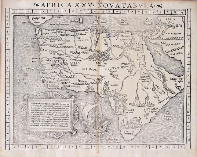 | Keywords: AFRICA XXV NOVA TABULA.jpg First map to show the entire continent of Africa <br>Uncolored <br>257 x 345 mm <br>Appeared in Munster's edition of Claudius Ptolemy's Geographia in 1540 http //www betzmaps com/AF-550 html 1552 Creator Sebastian Münster Public Domain PD-old-100 1550s maps of Africa 1552 1552 maps Sebastian Münster Pseudo-Ptolemaic regions |