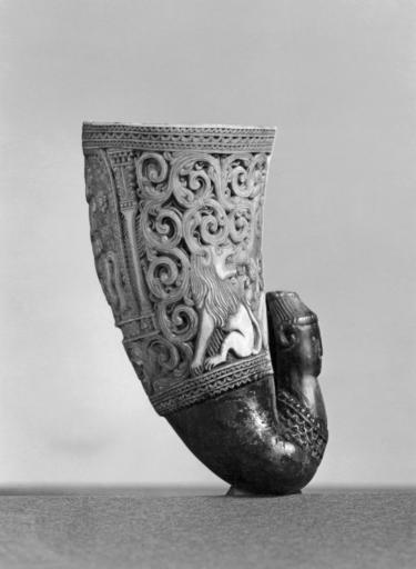 | Keywords: African - Carved Ram's Horn Cup with Lions and Mounted Rider - Walters 7218.jpg The exterior of this piece is intricately carved in low relief with a figure of a mounted nobleman and heraldic lions among leaf rinceaux The cup terminates in a carved bust This intriguing drinking cup is installed in the chamber of Wonders with objects from Asia and Africa Seventeenth-century collectors often could not be sure where objects obtained from sea captians and traders actually came from We don't know where this piece was made Do you between 1500 1700 Early Modern carved horn ram cm 8 26 accession number 72 18 34052 Henry Walters New York date and mode of acquisition unknown Sadie Jones Mrs Henry Walters New York 1931 by inheritance Mrs Henry Walters Sale New York May 1 1941 no 1025 Walters Art Museum 1941 by purchase Museum purchase formerly part of the Walters Collection 1941 World of Wonder The Walters Art Gallery Baltimore 1971-1972 place of origin Asia Walters Art Museum license Lions in decorative arts Drinking horns Collections of the Walters Art Museum Unidentified art |