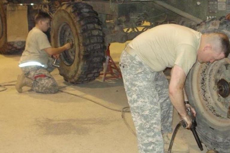 | Keywords: Aggressive Maintenance Keeps Trucks Rollin' DVIDS115408.jpg en Heavy wheeled vehicle operators and members of the 15th Transportation Company 165th Combat Sustainment Support Battalion 1st Sustainment Brigade Spc Amanda Bryant a native of Reno Nevada and Staff Sgt Michael McManama a native of Rialto Calif remove tires on a M1076 palletized loading system trailer in order to repack the wheel bearings with grease 2008-09-15 https //www dvidshub net/image/115408 115408 2008-09-15 09 08 CAMP TAJI IQ PD-USGov Manama Camp Taji Images from DoD uploaded by Fæ |