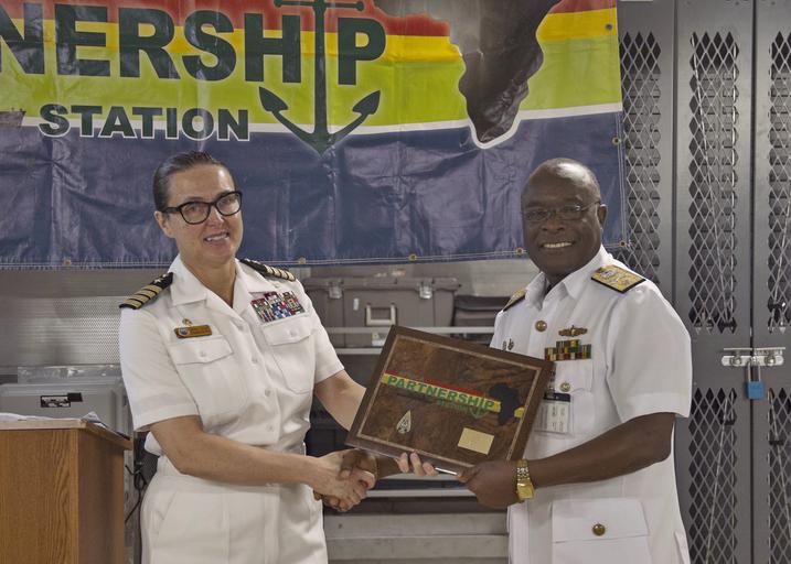 | Keywords: Agle Yawson Sekondi 2016-02-16 B002b.jpg SEKONDI Ghana Feb 16 2016 Capt Heidi Agle commodore Military Sealift Command Europe and Africa presents a plaque to Commodore Mark Ransford Nanabayin Yawson flag officer commanding Eastern Naval Command during the closing ceremony of the Ghana portion of African Maritime Law Enforcement Partnership Exercise aboard USNS Spearhead T-EPF 1 Feb 16 2016 The Military Sealift Command expeditionary fast transport vessel USNS Spearhead is on a scheduled deployment to the U S 6th Fleet area of operations to support the international collaborative capacity-building program Africa Partnership Station https //www flickr com/photos/cne-cna-c6f/25067493605 This photo at Flickr Amanda Dunford U S Navy Mass Communication Specialist 1st Class 2016-02-16 PD-USGov-Military-Navy Sekondi-Takoradi in 2016 People of the Ghana Navy United States Navy in Sekondi-Takoradi Dress uniforms of the Ghanaian Navy |
