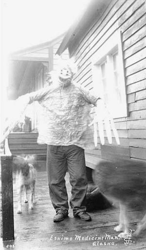 | Keywords: Aglegmiut shaman in costume, Nushagak, ca 1908 (THWAITES 116).jpeg check categories 27 October 2016 2 Photograph Creator John E Thwaites Although forbidden by the Christian missionaries these masks and outsized hands were still made and used in the early 1900s by the Aglegmiut The photographs taken by John Thwaite are believed to be the only images of an actual shaman wearing these ceremonial costumes Caption on image Eskimo medicine man Alaska PH Coll 247 180 Subjects LCTGM Shamans--Alaska--Nushagak Subjects LCSH Ceremonial objects--Alaska--Nushagak; Koniagmiut Eskimos--Clothing--Alaska--Nushagak; Koniagmiut Eskimos--Alasks--Nushagak--Rites and ceremonies; Indians of North America--Alaska--Nushagak depicted place United States--Alaska--Nushagak ca 1908 Institution University of Washington UWASH-THWAITES-source accession number thwaites 116 PD-old-auto-1923 1940 Information field Order Number THW098 Images from the John E Thwaites Photographs of Alaska Collection to check Shamans Ceremonial objects |