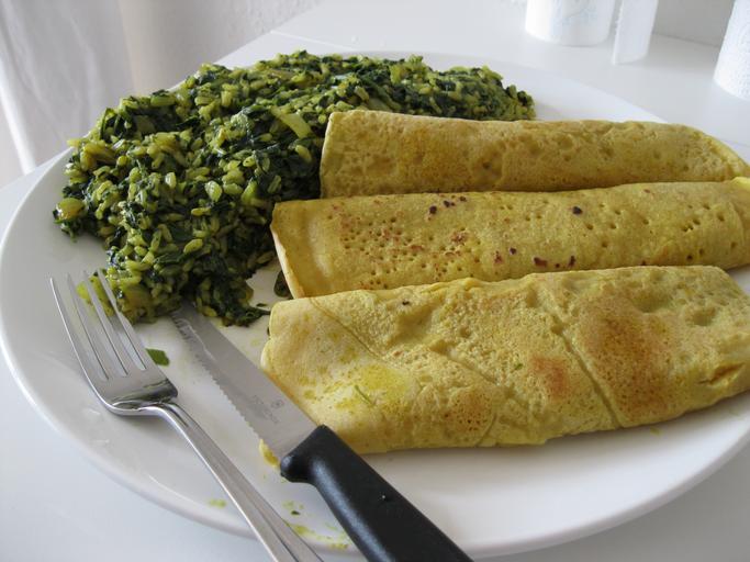 Keywords: Ailin27VeganPancakeSpinachRice.JPG en Vegan pancakes made of durum wheat with spinach and rice own AilinParsa Cc-zero Vegan meals Vegan pancakes