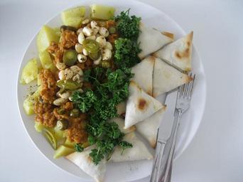 Keywords: Ailin9VeganSamosa.JPG en Vegan Samosa own AilinParsa Cc-zero Vegan food Triangular samosas
