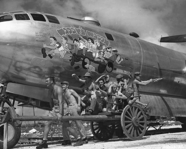| Keywords: Air Force personnel & equipment. The Pacific, England, Wash. DC. 1942-44 (mostly 1943) - NARA - 292576.jpg Scope and content B-29 Men bombed Tokyo The crew of Waddy's Wagon fifth B-29 to take off on the initial Tokyo mission from Saipan and first to land after bombing the target Crew members posing here to duplicate their caricatures on the plane are Plane C O Capt Walter R Waddy Young Ponca City Okla former All-American end; Lt Jack H Vetters Corpus Christi Texas pilot; Lt John F Ellis Moberly Mo bombardier; Lt Paul R Garrison Lancaster Pa navigator; Sgt George E Avon Syracuse N Y radio operator; Lt Bernard S Black Woodhave L I Flight Engineer; Sgt Kenneth M Mansie of Randolph Me Tech and gunners - Sgts Lawrence L Lee Max N D ; Wilbur J Chapman Panhandle Texas; Corbett L Carnegie Grindstone Island N Y and Joseph J Gatto Falconer N Y General notes The crew of the USAAF Boeing B-29-40-BW Superfortress s/n 42-24598 Waddy's Wagon 20th Air Force 73rd Bomb Wing 497th Bomb Group 869th Bomb Squadron This aircraft was lost on 9 January 1945 292576 Local identifier Department of Defense Department of the Army Fort Leavenworth Kansas 09/18/1947 - NARA's Central Plains Region Kansas City NREA 400 West Pershing Road Kansas City MO 64108 1943 Record group Record Group 338 Records of U S Army Operational Tactical and Support Organizations World War II and Thereafter 1917 - 1999 Record group ARC 651 Ft Leavenworth Signal Corps Photograph Collection Equipment File compiled 1939 - 1965 Series ARC 292562 File unit File unit ARC Variant control numbers NAIL Control Number NRE-338-FTL EF -2700 7 Other versions <gallery> File Air_Force_personnel_ amp _equipment _The_Pacific _England _Wash _DC _1942-44_ mostly_1943 _-_NARA_-_292576 tif tif File Air_Force_personnel_ amp _equipment _The_Pacific _England _Wash _DC _1942-44_ mostly_1943 _-_NARA_-_292576 jpg jpg </gallery> NARA-cooperation PD-USGov Nose art on B-29 Waddy's Wagon Radio operators aircraft Air gunners 497th Bombardment Group United States Army Air Forces Group photographs with aircraft military |