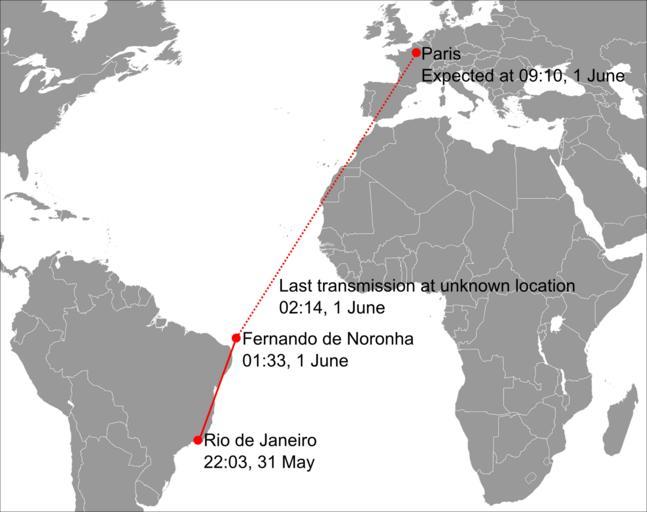 Keywords: Air France Flight 447 path.png Air France Flight 447 on 31 May/1 June fr Version anglais du plan de vol du vol Air France 447 du 31 mai 2009 de Strecke des Air France-Fugs 447 am 31 Mai/1 Juni 2009 Englischsprachige Beschriftung Air France - Voo 447 - feito na madrugada de 31 de maio para 1 de junho A linha vermelha contínua mostra a rota que o avião deveria seguir e a linha tracejada é a rota prevista para depois do ponto onde o radar perdeu contato com o avião own with help from http //news bbc co uk/1/hi/world/americas/8076848 stm French plane lost in ocean storm Jolly Janner 2009-06-01 <gallery> File Air France Flight 447 path svg Vector File Plan de vol AF447 png En français </gallery> ImageNote 1 441 950 269 100 1432 1134 2 Rio de Janeiro 22 03 31 May ImageNoteEnd 1 ImageNote 2 532 725 395 102 1432 1134 2 Fernando de Noronha 01 33 1 June ImageNoteEnd 2 ImageNote 3 609 602 675 106 1432 1134 2 Last transmission at unknown location 02 14 1 June ImageNoteEnd 3 ImageNote 4 929 98 462 93 1432 1134 2 Paris Expected at 09 10 1 June ImageNoteEnd 4 AF447 2009-05-31 overnight 2009-06-01 flight paths |