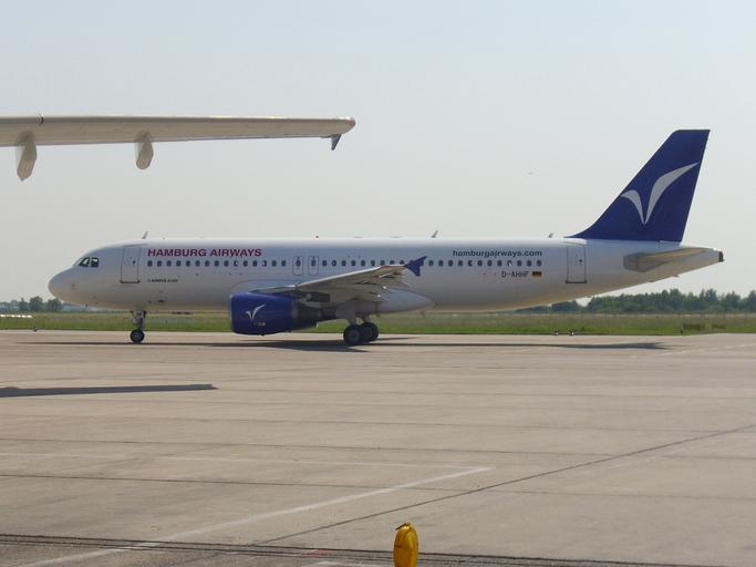 Keywords: Airbus A320 HamburgAirways D-AHHF (3).jpg en An Airbus A320 of Hamburg Airways is taxiing to the runway 27 of the airport of Bremen own Tvabutzku1234 2013-06-08 53 3 3 75 N 8 47 13 67 E region DE_heading SW D-AHHF aircraft Cc-zero