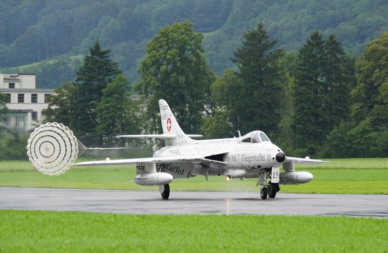 Keywords: aircraft hunter papyrus-hunter fighter aircraft a beam civil oldtimer built in 1950 air show landing brake screen mollis switzerland