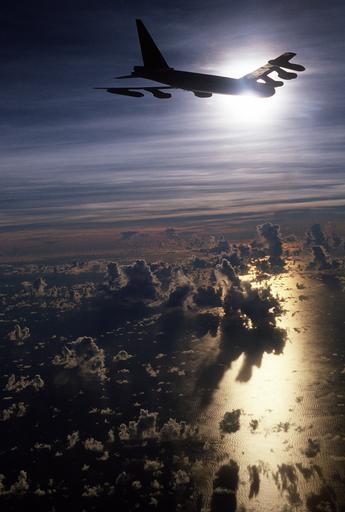 Keywords: airplane silhouette sun flying flight aircraft sky jet plane aviation clouds shadows scenic military b-52 evening