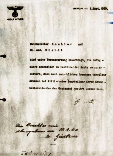 Keywords: Aktion brand.jpg Hitler's order for the žAktion T4 which led to 70 000 people being killed Own 2008-03-09 Marcel picture taken at nuernberg documentation-center museum On Adolf Hitler's personal stationary the edict reads žReichsleiter Bouhler und Dr med Brandt sind unter Verantwortung beauftragt die Befugnisse namentlich zu bestimmender Ärzte so zu erweitern dass nach menschlichem Ermessen unheilbar Kranken bei kritischster Beurteilung ihres Krankheitszustandes der Gnadentod gewährt werden kann -- A Hitler The handwitten comment reads Von Bouhler mir übergeben am 27 8 40 - Dr Gürtner English given to me by Bouhler on 27 8 August 1940; Dr Gürtner Franz Gürtner was Minister for Justice Reichsjustizminister from 1932 to his death in 1941 Philipp Bouhler was a SS-Obergruppenführer and leader of Hilter's Chancellery Kanzlei des Führers; KdF Karl Brandt Letters written messages 1939-09-01 Documents associated with World War II Action T4 |