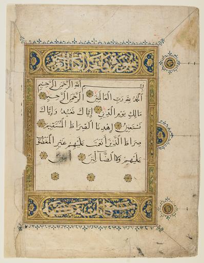 Keywords: Al Fatihah - naskh script.jpg en Dimensions of Written Surface 15 4 w x 15 5 h cm Script naskh This Qur'anic fragment contains the first chapter of the Qur'an entitled al-Fatihah The Opening Recited at the very beginning of the Qur'an this surah proclaims God as Gracious and Merciful the Master of the Day of Judgment and the Leader of the straight path The illuminated upper and lower panels contain a text outlined in gold ink to let the plain folio show through stating that this surah is the opening of the Holy Book Fatihat al-Kitab al-'Aziz and contains seven ayahs revealed in Mecca These illuminated cartouches contain gold vine and flower motifs interlacing on a blue background In the right margin appear two gold and blue decorative roundels and one semi-roundel in the center The text itself is written in the cursive script called naskh and each verse is separated by an ayah marker consisting of a gold six-petalled rosette with blue and red dots on its perimeter Both the script and the illumination are typical of Qur'ans produced in Mamluk Egypt during the 14th and 15th centuries Above the first two ayah markers on the first line of text immediately after the initiatory bismillah appears the word la no in red ink indicating that the reciter must not stop at the places indicated Finally this fragment is particular in several ways there are four extra verse markers at the very end of the surah a mistake that has been rectified partially by the addition of the exclamatory terminal praise amin Amen between the last correct verse marker and the first additional marker The spaces between the last three verse markers on the lowermost line remain empty http //hdl loc gov/loc amed/ascs 071 Library of Congress Unknown Calligrapher 14th-15th centuries PD-Art Al Fatihah - naskh script detail text jpg Naskh script Bahri dynasty Qur'an manuscripts 14th-15th century Library of Congress Arabic Persian and Ottoman calligraphy collection Egypt in the 14th century Egypt in the 15th century |