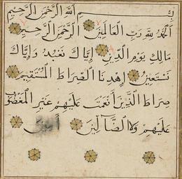 Keywords: Al Fatihah - naskh script detail text.jpg This is only a detail Naskh text only cvereb Al_Fatihah_-_naskh_script jpg en Dimensions of Written Surface 15 4 w x 15 5 h cm Script naskh This Qur'anic fragment contains the first chapter of the Qur'an entitled al-Fatihah The Opening Recited at the very beginning of the Qur'an this surah proclaims God as Gracious and Merciful the Master of the Day of Judgment and the Leader of the straight path The illuminated upper and lower panels contain a text outlined in gold ink to let the plain folio show through stating that this surah is the opening of the Holy Book Fatihat al-Kitab al-'Aziz and contains seven ayahs revealed in Mecca These illuminated cartouches contain gold vine and flower motifs interlacing on a blue background In the right margin appear two gold and blue decorative roundels and one semi-roundel in the center The text itself is written in the cursive script called naskh and each verse is separated by an ayah marker consisting of a gold six-petalled rosette with blue and red dots on its perimeter Both the script and the illumination are typical of Qur'ans produced in Mamluk Egypt during the 14th and 15th centuries Above the first two ayah markers on the first line of text immediately after the initiatory bismillah appears the word la no in red ink indicating that the reciter must not stop at the places indicated Finally this fragment is particular in several ways there are four extra verse markers at the very end of the surah a mistake that has been rectified partially by the addition of the exclamatory terminal praise amin Amen between the last correct verse marker and the first additional marker The spaces between the last three verse markers on the lowermost line remain empty Al_Fatihah_-_naskh_script jpg 2010-03-11 00 21 UTC Al_Fatihah_-_naskh_script jpg Unknown Calligrapher derivative work Cvereb <span class signature-talk >talk</span> PD-old original upload log This image is a derivative work of the following images File Al_Fatihah_-_naskh_script jpg licensed with PD-Art PD-old 2009-06-25T02 36 58Z Mangostar 3564x4588 5675369 Bytes <nowiki>higher res </nowiki> 2008-06-06T18 44 39Z DrFO Jr Tn 1024x1318 276634 Bytes <nowiki> en This Qur'anic fragment contains the first chapter of the Qur'an entitled al-Fatihah The Opening The text itself is written in the cursive script called naskh and each verse is separated b</nowiki> Uploaded with derivativeFX Naskh script Bahri dynasty Library of Congress Arabic Persian and Ottoman calligraphy collection Qur'an manuscripts 14th-15th century |