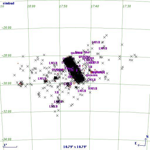 Keywords: Aladin2011.03.31-SgrXR-1.png en Sky plot of the X-ray sources within the two error regions for each location of Sagittarius XR-1 The first detection at J2000 0 RA 17h 58m 11 13s Dec -29° 12' 14 9 has a 3° diameter error circle at the east This overlaps the large polygonal error box for the second detection at J2000 0 RA 17h 48m 12 31s Dec -30° 00' 58 6 which trends SE to NW in the sky plot The intense collection of X-ray sources within the polygon of the second detection is a series of deep penetration Chandra X-ray Observatory visibly dark X-ray sources Credit Aladin at SIMBAD Me using Aladin at SIMBAD url http //simbad u-strasbg fr/simbad/ Me and Aladin at SIMBAD 2011-03-31 I sent an email to question simbad u-strasbg fr regarding use of applet Aladin generated sky plots Pierre Fernique astro unistra fr stated There is absolutely no problem to use them for Wikipedia pages A citation of Aladin would be appreciated Legend X - X-ray source red + - HII region red - star red square - nebula LMXB - low-mass X-ray binary XB - X-ray binary gamma - gamma-ray source Nova-like - Nova-like star Seyfert - Seyfert galaxy Cc-zero X-ray astronomy Astronomical diagrams |