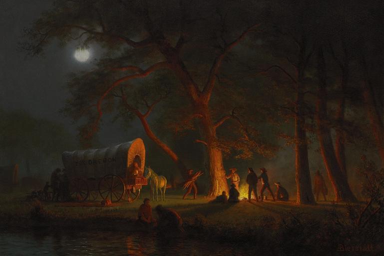 | Keywords: Albert Bierstadt - Oregon Trail.jpg Artwork Creator Albert Bierstadt 1863 oil canvas board cm 75 6 111 8 object history credit line Provenance The artist <br/>Mrs Mary Bierstadt wife of the artist <br/>Private collection Ossining New York gift from the above <br/>By descent <br/> WithKennedy Galleries New York 1978 <br/>Private collection Detroit Michigan 1980 <br/>WithVose Galleries Boston Massachusetts 1984 <br/>Private collection Seekonk Rhode Island by 1984 <br/>WithJordan Volpe New York 1989 <br/>Private collection Dublin New Hampshire <br/>Private collection Wyoming 2005 signed with conjoined initials 'ABierstadt' lower right accession number Christie's online 5199650 <gallery>File Campfire Albert Bierstadt 1863 jpg <center>Campfire</center> File Emigrants Crossing the Plains or The Oregon Trail Albert Bierstadt 1869 jpg <center>Emigrants Crossing the Plains</center> </gallery> PD-old-100 Landscape paintings of the United States by Albert Bierstadt Oregon Trail Covered wagons in art Night in art Rivers of the United States in art Darkness |