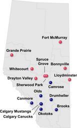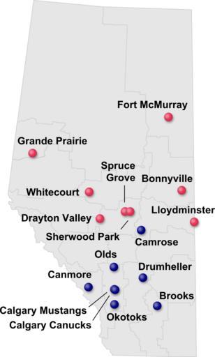 | Keywords: Alberta Junior Hockey League locations.svg en Locations of teams in the Alberta Junior Hockey League Red markers correspond to North Division teams; blue markers correspond to South Division teams own Two Hearted River 2011-09-30 Cc-zero Maps of Alberta |