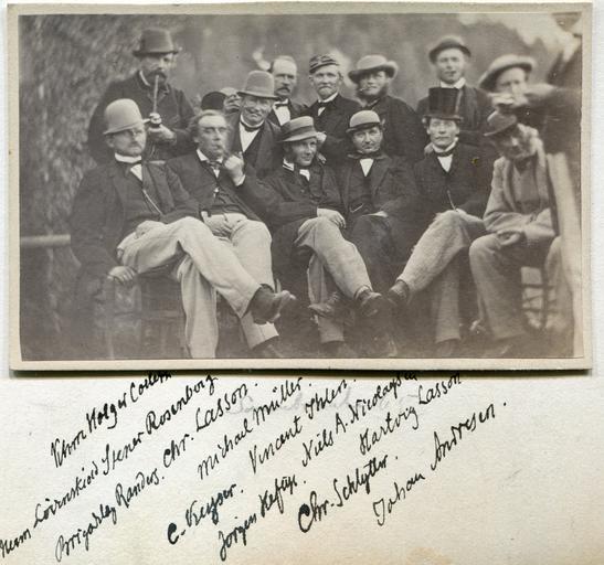 | Keywords: gruppe alene gruppealene thomas j. heftye thomasjheftye thomas heftye thomasheftye heftye thomas johannessen heftye thomasjohannessenheftye stener rosenberg stenerrosenberg chr. schlytter chrschlytter fredrik næser fredriknæser randers niels a. nicolaysen nielsanicolaysen michael muller michaelmuller herman severin løvenskiold hermanseverinløvenskiold christian carl otto lasson christiancarlottolasson hartvig marcus lassen hartvigmarcuslassen joahn carl keyser joahncarlkeyser vincent ihlen vincentihlen jørgen haslef heftye jørgenhaslefheftye holger collett holgercollett johan henrik andresen johanhenrikandresen 16. juli 1865, &quot;herrelag&quot; i anledning Stener Rosenbergs 47-årsdag. På bildet Bakerste rekke: Collett, Rosenberg, Lasson, Müller, Ihlen, Nicolaysen, Lassen. Første rekke: Løvenskiold, Randers, Keyser, Jørgen Heftye, Schlytter og Andresen. Mer om disse karene: - Andresen, Johan Henrik (1815 - 1874, foretningsmann. Kjøpte J. L. Tiedemans tobaksfabrik i 1849) - Collett, Holger (1807 - 1870, dikter, kammerherre, eidsvollsmann) - Heftye, Jørgen Haslef (1828 - 1900, Thomas’ bror) - Ihlen, Vincent (Ihlen var et skogeiernavn fra Lørenskog??) - Keyser, Johan Carl (1827 - 1904 - teolog og skolemann - var huslærer for Peder Anker Wedel jarlsberg)) - Lassen, Hartvig Marcus (1824 - 1897, litteraturhistoriker, redaktør og lærebokforfatter) - Lasson, Christian Carl Otto (1830 - 1893, far til Oda Krohg og Bokken Lasson, regjeringsadvokat og kulturinteressert) - Løvenskiold, Herman Severin (gift med Thomas’ kusine Johanne &quot;Mimsi&quot;) - Muller, Michael - Nicolaysen, Niels A. (1832 - ? ) Høyesterettsadvokat - Randers (brigader?) - Rosenberg, Stener (1818 - ?) grosserer, &quot;hedersgjest&quot;) - Schlytter, Chr. (På turen, men ikke på bildet) - Fredrik Næser (gift med Thomas’ søster) - W. Rosenberg Se også hilsen fra den samme gjengen i gjestebok nr 1; &lt;a www.flickr.com/photos/133429043@N02/17724710069/in/album-... Kilde for personer på bildet: oslobilder.no/OMU/OB.NW4596 16. juli 1865, "herrelag" i anledning Stener Rosenbergs 47-årsdag. På bildet Bakerste rekke: Collett, Rosenberg, Lasson, Müller, Ihlen, Nicolaysen, Lassen. Første rekke: Løvenskiold, Randers, Keyser, Jørgen Heftye, Schlytter og Andresen. Mer om disse karene: - Andresen, Johan Henrik (1815 - 1874, foretningsmann. Kjøpte J. L. Tiedemans tobaksfabrik i 1849) - Collett, Holger (1807 - 1870, dikter, kammerherre, eidsvollsmann) - Heftye, Jørgen Haslef (1828 - 1900, Thomas’ bror) - Ihlen, Vincent (Ihlen var et skogeiernavn fra Lørenskog??) - Keyser, Johan Carl (1827 - 1904 - teolog og skolemann - var huslærer for Peder Anker Wedel jarlsberg)) - Lassen, Hartvig Marcus (1824 - 1897, litteraturhistoriker, redaktør og lærebokforfatter) - Lasson, Christian Carl Otto (1830 - 1893, far til Oda Krohg og Bokken Lasson, regjeringsadvokat og kulturinteressert) - Løvenskiold, Herman Severin (gift med Thomas’ kusine Johanne "Mimsi") - Muller, Michael - Nicolaysen, Niels A. (1832 - ? ) Høyesterettsadvokat - Randers (brigader?) - Rosenberg, Stener (1818 - ?) grosserer, "hedersgjest") - Schlytter, Chr. (På turen, men ikke på bildet) - Fredrik Næser (gift med Thomas’ søster) - W. Rosenberg Se også hilsen fra den samme gjengen i gjestebok nr 1; <a www.flickr.com/photos/133429043@N02/17724710069/in/album-... Kilde for personer på bildet: oslobilder.no/OMU/OB.NW4596 |