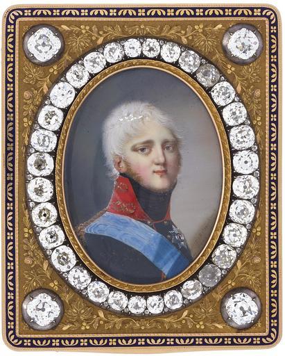 Keywords: Alexander I by D.Bossi 2.jpg Artwork Creator Domenico Bossi Portrait of male Portrait facing right in black coat with gold-embroidered red collar wearing the blue moiré sash and breast star of the Russian Order of St Andrew Exceptionnelle tabatière impériale russe en or émail et diamants par Keibel ornée d ™une miniature par Bossi représentant le portrait du Tsar Alexandre Ier de Russie La boîte rectangulaire en or rose et jaune est très finement ciselée de rinceaux de fleurs de rosaces et de feuillages en relief sur fond amati les angles arrondis sont ornés dans un cartouche carré d'une rosace en émail champlevé bleu roi et bleu ciel les bordures latérales ainsi que celles du couvercle et du revers sont ornées d'une baguette en émail bleu roi champlevé sur or rose le dos présente également un ciselage d ™une très grande finesse arrangé autour de motifs circulaires en émail bleu ciel et bleu roi Poinçonné deux fois à l ™intérieur Keibel pour Otto Samuel Keibel maître orfèvre à St Petersbourg de 1797 à 1809 Le couvercle à charnières présente une miniature ovale sur ivoire du portrait du Tsar Alexandre Ier 1777-1825 en manteau noir à col rouge portant le bandeau bleu moiré et l ™insigne de l'ordre impérial de Saint-André peinte par Giovanni Domenico Bossi 1765-1853 signée et datée 1803 Elle est majestueusement bordée de 32 diamants environ 28 carats subtilement séparés d ™autant de petites roses de diamants Quatre autres diamants environ 8 8 carats ornent chacun des coins St Petersburg circa 1803 9x7 5x1 5 cm 253g numéros d ™inventaires 79 et 641 Dans son écrin de velours de soie vert et rouge encadré par une broderie de fils d ™or Provenance Prince Antonio Comuto de Zantes Grèce par héritage dans la même famille jusqu ™Ã ce jour La famille Comuto est venue à Zante du Péloponèse vers l ™an1500 Elle fut inscrite au Livre d ™Or de la noblesse de Zante à la fin du XVIe siècle En 1626 elle fut élevée au titre de comte en la personne du Dr Stamatello Comuto Les membres de cette famille ont ensuite occupé les plus hautes charges de l ™Etat Grand intellectuel le comte Antonia Comuto 1748-1833 a étudié la philosophie la littérature et obtient un doctorat de droit à l ™université de Padoue A son retour à Zante il est nommé membre du Grand Conseil inspecteur des écoles puis élu député au Parlement ionien Sénateur puis Président Les ÃŽles Ioniennes à l ™ouest de la Grèce ont été longtemps sous la domination vénitienne En 1797 elles sont annexées par la France puis en 1800 l ™archipel est occupé par les forces russo-ottomanes et est placé sous protectorat sous le nom de la République des Sept-ÃŽles Le 7 décembre 1803 le comte Comuto est élevé au titre de Prince de l ™Etat Septinsulaire sur l ™ordre exprès de SM l ™Empereur de Russie C ™est à l ™occasion de cette promotion au titre de gouverneur qu ™il reçoit du Tsar Alexandre Ier la présente boîte Reference Livre d'Or de la noblesse Ionienne - Corfou Céphalonie Zante Eugène Rizo Rangabè Maison d'éditions Eleftheroudakis Athènes 1925 3rd volume pages 69-72 Pour une boîte similaire mais sans diamant the Gilbert Loan at the Victoria Albert Museum London ref 442-2008 1803 Technique miniature oval mm 36 unknown D Bossi pinx 1803 signature/date lower right http //www hoteldesventes ch/176-37 other versions PD-old-100 DEFAULTSORT 1803; Alexander I of Russia Files uploaded by Shakko from various sources Domenico Bossi Alexander I of Russia in portrait miniatures 1803 portrait paintings Male 19th-century oval portrait miniatures of men at bust length Portrait paintings in 19th-century military uniforms of Russia Sashes of chivalric orders in portrait paintings Stars of chivalric orders in portrait paintings Three-quarter view portrait paintings of men facing right Johann Wilhelm Keibel |