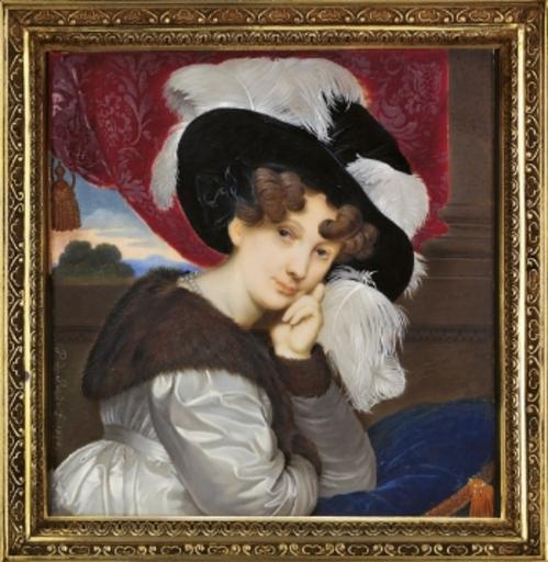Keywords: Alexandrine Saltykova by P.Rossi.jpg Александ ина Салтыкова PIETRO DE ROSSI RUSSIAN 1761-1831 Princess Alexandrine Saltykova in white satin dress with mink collar and cuffs pearl necklace with emerald-cut sapphire and pearl clasp Prussian blue velvet bow and hat adorned with ostrich plumes chestnut hair dressed in ringlets her left arm leaning on a royal blue velvet pillow with gold embroidery and tassels; damask curtain with gilt tie-back and classicising landscape background signed and dated 'P de Rossi f 1828 ' lower left on ivory rectangular 4 1/8 x 4 1/16 in 106 x 103 mm ormolu frame with concentric waterleaf and tongue and scroll and trefoil borders elaborate foliate motifs and medallions adorning the spandrels ornately scrolled and festooned frame wings Provenance The sitter's daughter Anastasia Sergeyevna Saltykova 1810-1853 Imperial Russian lady-in-waiting and wife of Royal Norwegian Embassy Counsellor Christian Fredrik Jacob von Munthe af Morgenstierne 1806-1886 Their only daughter Alexandra Cathrine Henriette von Munthe af Morgenstierne 1838-1881 wife of Christian Carl Otto Lasson 1830-1893 Their fifth child Marie Lasson b 1864 Thence by family descent Christie's online 5160919 century 19 Creator Pietro de Rossi House of Saltykov Pietro de Rossi Files uploaded by Shakko from various sources Portraits of people thinking Ringlets hair fashion Ostrich feathers Munthe af Morgenstierne PD-old-100 |