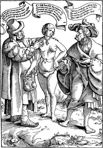 | Keywords: Alfons luder kunde.gif A 16th-century ca 1540 German satirical print whose general theme is the uselessness of chastity belts in ensuring the faithfulness of beautiful young wives married to old ugly husbands The young wife is dipping into the bag of money which her old husband is offering to give her to encourage her to remain placidly in the chastity belt he has locked on her but she intends to use it to buy her freedom to enjoy her handsome lover who is bringing her a key For another closely-related 16th century woodcut with different artwork and the poem spelled according to a different German dialect but basically the same idea see Image 16thc-German-woodcut-Chastity-belt jpg Here's the transcript of the text in the woodcut which is provided in Eric John Dingwall's 1931 book The Girdle of Chastity thumb right Other version The old husband a Gelt und gütz gnung wil ich dir geben Wiltü nach meinen willen leben Greift mitter hannd in meiner tasschen Des sloss will ich dich auch erlassen His young wife b Es hilft kain shloß für frauwen list kain trew mag sein dar lieb nit ist Darumb ain slüssel der mir gefelt Den wöl ich kauffen umb dein gelt Her lover c Ich drag ein Slüssel zw solliche slossen Wie wol es manchen hat verdrossen Der hat der narren kappen fill Der rechte lieb erkäuffen will Here's an attempted rendering of this text into modern German Geld und Güter genug will ich dir geben willst du nach meinem Willen leben Greif mit der Hand in meine Tasche das Schloss will ich dir erlassen Es hilft kein Schloss vor der Frauen List keine Treue kann sein wo Liebe nicht ist Darum einen Schlüssel der mir fehlt den will ich kaufen um für dein Geld Ich trage einen Schlüssel zu diesem Schloss obwohl es manchen verdrossen hat Der hat der Narrenkappe viel der rechte Liebe erkaufen will Dingwall translates what the wife says as No lock is of avail against the cunning of women; there can be no fidelity where love is not present for that reason will I buy with your money the key I lack This print has been attributed to Peter Flötner and Hans Baldung but Dingwall prefers to attribute it to H Vogtherr however it is not entirely clear to me whether Dingwall is referring to this version or to the alternative version Image 16thc-German-woodcut-Chastity-belt jpg fr Ceinture de chasteté Caricature allemande de la Renaissance avec un mari vieilli riche une jeune épouse ceinturée rétive et un bel amant Scanning source From Karikatur-album C E Jensen MDCCCCVI For a completely different Renaissance chastity-belt caricature though expressing the same basic sentiments see File Chastity belt satire jpg Note that historically the use of chastity belts was a Renaissance phenomenon not actually medieval PD-old-100 Female chastity devices Money in art Topless standing women in art Moneybags 16th-century etchings Artworks missing infobox template |