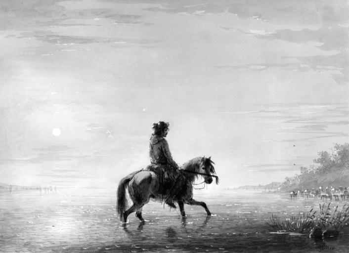 Keywords: Alfred Jacob Miller - Crossing The River - Trapper Trying Its Depth - Walters 371940119.jpg When the caravan approached a river a trusty and experienced man is selected whose business it is to cross the river and try its depths and then return by a different route looking out for the shallowest parts and marking them in his mind's eyes as a trail for the company If the river was not shallow enough for the wagons to cross everything had to be unloaded and bull boats- the wagon beds covered with buffalo hides- had to be constructed and all the caravan's goods floated across between 1858 1860 watercolor paper cm 22 2 31 2 accession number 37 1940 119 11813 William T Walters Baltimore 1858-1860 by commission Henry Walters city Baltimore Walters Art Museum Henry Walters Commissioned by William T Walters 1858-1860 Alfred Jacob Miller An Artist on the Oregon Trail place of origin USA Walters Art Museum license 2D Alfred Jacob Miller An Artist on the Oregon Trail Paintings by Alfred Jacob Miller in the Walters Art Museum 19th-century watercolor paintings in the United States Rivers of the United States in art Horse riding in paintings |