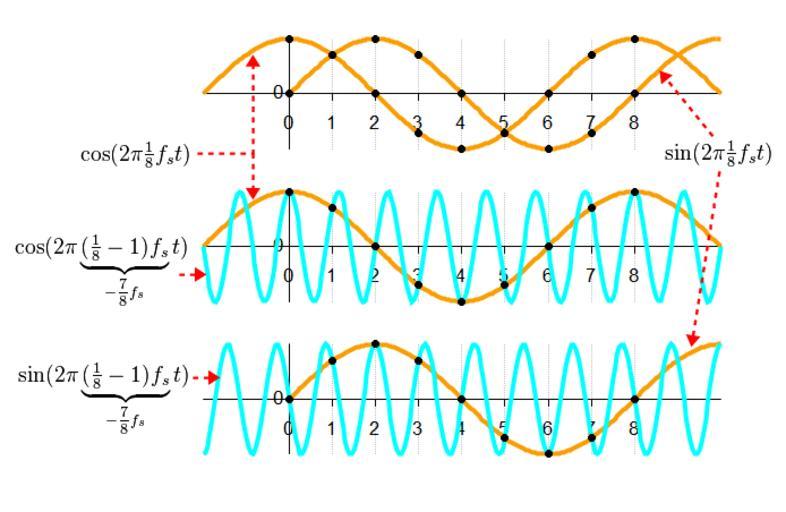 Keywords: Aliasing between a positive and a negative frequency.png en This figure depicts two complex sinusoids colored gold and cyan that fit the same sets of real and imaginary sample points They are thus aliases of each other when sampled at the rate f<sub>s</sub> indicated by the grid lines The gold-colored function depicts a positive frequency because its real part the cos function leads its imaginary part by 1/4 of one cycle The cyan function depicts a negative frequency because its real part lags the imaginary part 2013-03-27 01 09 45 own Bob K Octave script <source lang Matlab > graphics_toolkit gnuplot gold 251 159 3/256; arbitrary color choice sam_per_sec 1; T 1/sam_per_sec; sample interval dt T/20; time-resolution of continuous functions cycle_per_sec sam_per_sec/8; sam_per_sec 8 cycle_per_sec satisfies Nyquist figure subplot 3 1 1 xlim -2 10 ylim -1 3 1 3 Plot cosine function start_time_sec -2; stop_time_sec 10; x start_time_sec dt stop_time_sec; y cos 2 pi cycle_per_sec x ; plot x y 'color' gold 'linewidth' 4 box off no border around plot please hold on same axes for next 3 plots Plot sine function start_time_sec 0; stop_time_sec 10; x start_time_sec dt stop_time_sec; y sin 2 pi cycle_per_sec x ; plot x y 'color' gold 'linewidth' 4 Sample cosine function at sample-rate 1/T start_time_sec 0; stop_time_sec 8; x start_time_sec T stop_time_sec; y cos 2 pi cycle_per_sec x ; plot x y 'color' 'black' ' ' Sample sine function y sin 2 pi cycle_per_sec x ; plot x y 'color' 'black' ' ' set gca xaxislocation zero set gca yaxislocation zero set gca 'xgrid' 'on' ; set gca 'ygrid' 'off' ; set gca 'ytick' 0 ; set gca 'xtick' 0 8 ; subplot 3 1 2 xlim -2 10 ylim -1 3 1 3 cycle_per_sec2 cycle_per_sec - sam_per_sec; negative frequency Re-plot same cosine function on new axes start_time_sec -2; stop_time_sec 10; x start_time_sec dt stop_time_sec; y cos 2 pi cycle_per_sec x ; plot x y 'color' gold 'linewidth' 4 box off hold on Plot other cosine function start_time_sec -2; stop_time_sec 10; x start_time_sec dt stop_time_sec; y cos 2 pi cycle_per_sec2 x ; plot x y 'color' 'cyan' 'linewidth' 4 Sample cosine functions at sample-rate 1/T start_time_sec 0; stop_time_sec 8; x start_time_sec T stop_time_sec; y cos 2 pi cycle_per_sec x ; plot x y 'color' 'black' ' ' set gca xaxislocation zero set gca yaxislocation zero set gca 'xgrid' 'on' ; set gca 'ygrid' 'off' ; set gca 'ytick' 0 ; set gca 'xtick' 0 8 ; subplot 3 1 3 xlim -2 10 ylim -1 3 1 3 Re-plot original sine function on new axes start_time_sec 0; stop_time_sec 10; x start_time_sec dt stop_time_sec; y sin 2 pi cycle_per_sec x ; plot x y 'color' gold 'linewidth' 4 box off hold on Plot other sine function start_time_sec -2; stop_time_sec 10; x start_time_sec dt stop_time_sec; y sin 2 pi cycle_per_sec2 x ; plot x y 'color' 'cyan' 'linewidth' 4 Sample sine functions at sample-rate 1/T start_time_sec 0; stop_time_sec 8; x start_time_sec T stop_time_sec; y sin 2 pi cycle_per_sec x ; plot x y 'color' 'black' ' ' set gca xaxislocation zero set gca yaxislocation zero set gca 'xgrid' 'on' ; set gca 'ygrid' 'off' ; set gca 'ytick' 0 ; set gca 'xtick' 0 8 ; </source> cc-zero Uploaded with UploadWizard Aliasing Negative frequency Waveforms |