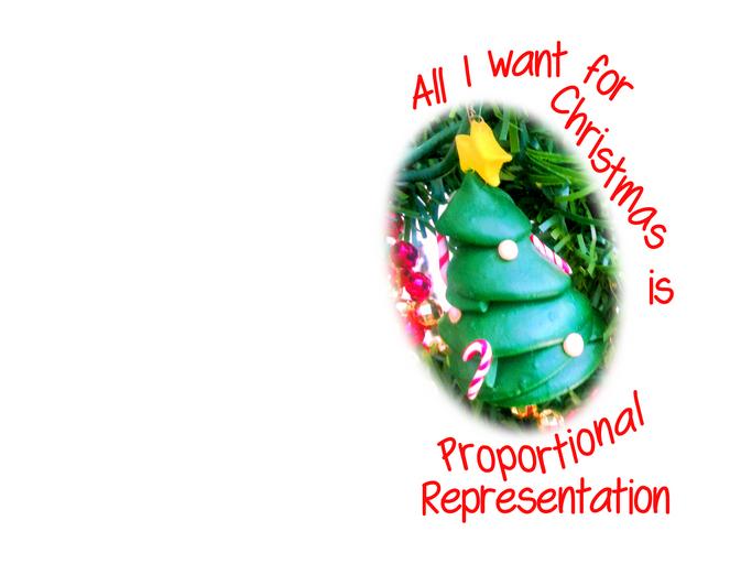 | Keywords: all i want for christmas is proportional representation alliwantforchristmasisproportionalrepresentation proportional representation proportionalrepresentation christmas postcard christmas card christmascard canadian politics 2016 pr4canada white background indoor 1 larger Christmas card print with "landscape" orientation 8.5 x 11" cardstock Fold in the centre, write your personal message to Maryam Monsef, The Minister of Democratic Institutions, or the Prime Minister, or your Member of Parliament on the inside. Place in 5 3/4" x 8 3/4" envelope (available where stationary is sold) and mail to: [Name] House of Commons Ottawa, Ontario K1A 0A6 Both Fair Vote Canada and the Green Party of Canada advocate sending similar cards; since neither are explicitly free culture (ie Public Domain or Licensed to Share, I've made these, which are released into the Public Domain via CC0. 1 larger Christmas card print with "landscape" orientation 8.5 x 11" cardstock Fold in the centre, write your personal message to Maryam Monsef, The Minister of Democratic Institutions, or the Prime Minister, or your Member of Parliament on the inside. Place in 5 3/4" x 8 3/4" envelope (available where stationary is sold) and mail to: [Name] House of Commons Ottawa, Ontario K1A 0A6 Both Fair Vote Canada and the Green Party of Canada advocate sending similar cards; since neither are explicitly free culture (ie Public Domain or Licensed to Share, I've made these, which are released into the Public Domain via CC0. |