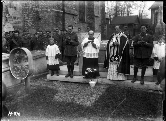| Keywords: blackandwhite monochrome black and white All Souls Day memorial funeral burial service to commemorate the New Zealand fallen, in the churchyard of St Martin's, Selles, Pas de Calais, France. Photograph taken 5 November 1917 by Henry Armytage Sanders. Inscriptions: Inscribed - Photographer's title on negative -bottom left: H370. The burial service followed a requiem mass inside the church. Quantity: 1 b&w original negative(s). Physical Description: Dry plate glass negative 4.75 x 6.5 inches All Souls Day memorial funeral burial service, in the churchyard of St Martin's, Selles, Pas de Calais, France. Royal New Zealand Returned and Services' Association :New Zealand official negatives, World War 1914-1918. Ref: 1/2-013004-G. Alexander Turnbull Library, Wellington, New Zealand. natlib.govt.nz/records/23098251 All Souls Day memorial funeral burial service to commemorate the New Zealand fallen, in the churchyard of St Martin's, Selles, Pas de Calais, France. Photograph taken 5 November 1917 by Henry Armytage Sanders. Inscriptions: Inscribed - Photographer's title on negative -bottom left: H370. The burial service followed a requiem mass inside the church. Quantity: 1 b&w original negative(s). Physical Description: Dry plate glass negative 4.75 x 6.5 inches All Souls Day memorial funeral burial service, in the churchyard of St Martin's, Selles, Pas de Calais, France. Royal New Zealand Returned and Services' Association :New Zealand official negatives, World War 1914-1918. Ref: 1/2-013004-G. Alexander Turnbull Library, Wellington, New Zealand. natlib.govt.nz/records/23098251 |