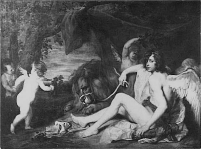 Keywords: Allegory on the Power of Love by Thomas Willeboirts Bosschaert.jpg Artwork creator Thomas Willeboirts Bosschaert Landschap met Amor zittend rechts kijkend naar de toeschouwer met de gebreidelde leeuw In het landschap ook drie putti waarvan er één Amor kroont met een lauwerkrans between 1628 1654 ucfirst oil on canvas cm 149 290 LangSwitch Lost Verloren gegaan place of discovery object history by 1935 Mauritshuis The Hague 265 ProvenanceEvent 1940-05 destroyed Burnt during the bombing of Middelburg exhibition history credit line accession number place of creation Antwerp rkd nl https //rkd nl Home https //rkd nl/en/explore/images/34512 Info Image extracted using http //veradekok nl/Dememorixer Dememorixer 34512 Allegorie op de macht van de liefde Amor met de gebreidelde leeuw 1628-1654 Q22949564 Greyscale added brightness and contrast modified Vincent Steenberg PD-Art-100 DEFAULTSORT Willeboirts Bosschaert Thomas 1628 Thomas Willeboirts Bosschaert 1628 Flemish paintings in the Mauritshuis Destroyed paintings |