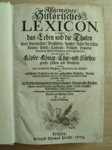 Keywords: Allgemeines Historisches Lexicon - 1709 - Dritter und Vierdter Theil - Titelblatt -.jpg Allgemeines Historisches Lexicon - 1709 - Dritter und Vierdter Theil - jpg Allgemeines Historisches Lexicon in welchem das Leben und die Thaten derer Patriarchen Propheten Apostel ¦ wie nicht weniger derer Käyser Könige Chur- und Fürsten ¦ ingleichen derer berühmten Gelahrten ¦ ferner ausführliche Nachrichten von den ansehnlichsten Gräflichen ¦ und andern Familien von Conciliis ¦ und endlich die Beschreibungen derer Käyserthümers Königreiche ¦ Landschafften ¦ und so fort; in Alphabetischer Ordnung mit bewehrten Zeugnissen vorgestellet werden Leipzig verlegts Thomas Fritsch 1709 hier Dritter und Vierdter Theil H “ Z Titelblatt Exemplar der Niedersächsischen Staats- und Universitätsbibliothek Göttingen Signatur <7> 2 H UN I 1358 1 Allgemeines Historisches Lexicon 1709 PD-old |