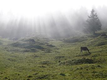 Keywords: alm alpe cow idyll meadow pasture mountain light shadow lichtspiel fog back light nature