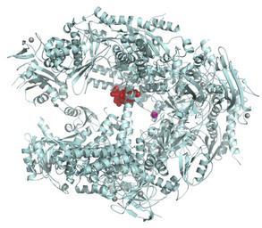 | Keywords: Alpha-Amanitin–RNA polymerase II complex 1K83.png Ribbon diagram of Saccharomyces cerevisiae RNA polymerase II in complex with α-amanitin red Active site magnesium ion visible in pink near center <br>Created using PyMOL http //pymol sourceforge net and GIMP Style and orientation made to match http //www pnas org/content/vol99/issue3/images/large/pq0326646002 jpeg ; Legend lightblue w RNA polymerase II magenta w Active site magnesium ion red -amanitin grey w Zinc ions From PDB entry http //www rcsb org/pdb/cgi/explore cgi pdbId 1K83 1K83 <br>More information Kornberg RD Structural basis of transcription alpha-amanitin-RNA polymerase II cocrystal at 2 8 A resolution Proc Natl Acad Sci USA 99 3 1218 “22 2002 PMID 11805306 10 1073/pnas 251664698 http //www pnas org/cgi/content/full/99/3/1218 Free full text 2007-11-14 Fvasconcellos 21 15 14 November 2007 UTC Transferases Alpha-amanitin |