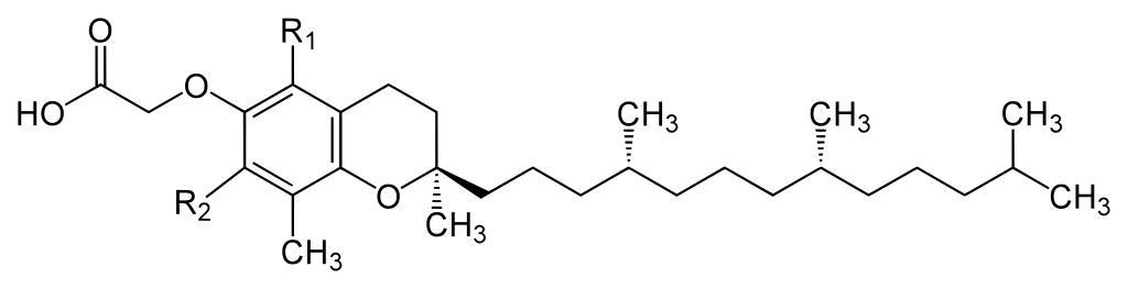 | Keywords: Alpha TEA.svg en alpha TEA α-TEA; alpha-TEA; RRR-α-tocopherol ether-linked acetic acid; 2 5 7 8-tetramethyl-2R- 4R 8R 12-trimethyltridecyl chroman-6-yloxy acetic acid;<br> α R<sup>1</sup> R<sup>2</sup> CH<sub>3</sub>; β R<sup>1</sup> CH<sub>3</sub> R<sup>2</sup> H; γ R<sup>1</sup> H R<sup>2</sup> CH<sub>3</sub>; δ R<sup>1</sup> R<sup>2</sup> H de äh siehe oben Own Yikrazuul 2008-11-14 Vitamin E | ||||