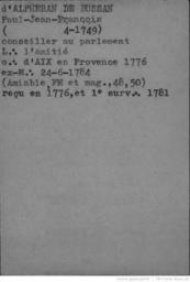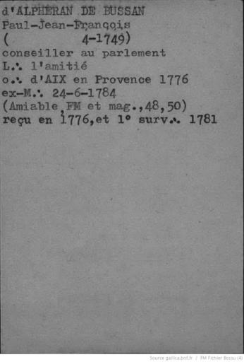 Keywords: Alpheran de Bussan, Paul-Jean-François d'.jpg en File of Freemason Paul-Jean-François d'Alphéran de Bussan 1749-1821 Scan from an original document fr Fiche du franc-maçon Paul-Jean-François d'Alphéran de Bussan 1749-1821 Numérisation effectuée à partir d ™un document original http //archivesetmanuscrits bnf fr/ark /12148/cc96734p FM Fichier Bossu 4 BnF 2014 BnF Paul-Jean-François d'Alphéran de Bussan Masonic documents |