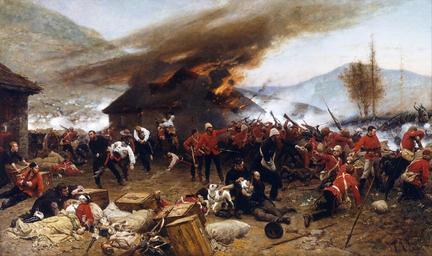 | Keywords: Alphonse de Neuville - The defence of Rorke's Drift 1879 - Google Art Project.jpg Painting of the Battle of Rorke's Drift which took place in Natal during the Anglo-Zulu War in 1879 De Neuville based the painting on eye witness accounts and it depicts several events of the battle occurring at once Defenders depicted in the painting Lieutenant John Chard to the right at the barrier in pale breeches with rifle Corporal Scammell of the Natal Native Contingent incorrectly shown in the uniform of the 24th or Corporal William Allen handing cartridges to Chard Corporal Ferdinand Schiess wearing a bandoleer and stabbing a Zulu at the barrier with his bayonet Chaplain George Smith bearded man handing out cartridges from a haversack Acting Assistant Commissary James Dalton sat in foreground with a wounded shoulder Surgeon James Reynolds attending to Dalton's wound Lieutenant Gonville Bromhead stood in the centre of the painting pointing to his left Private Frederick Hitch stood behind Bromhead Private Henry Hook carrying Private John Connolly on his back away from the burning hospital Assistant Commissary Walter Dunne to the left holding a biscuit box Sources David Saul 2005 Zulu The Heroism and Tragedy of the Zulu War of 1879 ISBN 9780141015699; Knight Ian 1996 Rorke's Drift 1879 'Pinned Like Rats in a Hole ISBN 9781855325067 1835 1835 1885 1885 Alphonse Male 439435 de Neuville 1835 - 1885 /collection/art-gallery-of-new-south-wales/artwork/the-defence-of-rorkes-drift-1879-alphonse-de-neuville/438475/ 3225 Alphonse de Neuville creator /artist/alphonse-de-neuville/4126245/ 4126245 /collection/art-gallery-of-new-south-wales/ Art Gallery of New South Wales 387002 http //www artgallery nsw gov au/ 12/3/2011 5 48 27 AM /collection/art-gallery-of-new-south-wales/artwork/the-defence-of-rorkes-drift-1879-alphonse-de-neuville/438475/ 1880 1880 oil on canvas France Fine Art Society PLC England estab 1876 London/England Purchased by the AGNSW from the Fine Art Society 1882 'The Defence of Rorke's Drift 1879' was commissioned by the Fine Art Society True 2610 438475 True 1880 /collection/art-gallery-of-new-south-wales/level/ground-level/6660469/ Ground level complete 3/24/2012 2 13 55 AM 735 http //www artgallery nsw gov au/work/735 Purchased 1882 Painting 1880 1890 w3770 x h2610 x d290 cm 1880 False 1 68421052631579 Object /collection/art-gallery-of-new-south-wales/level/ground-level/6660469/19th-20th-c-european-art/6646800/ 19th + 20th c European art the-defence-of-rorkes-drift-1879-alphonse-de-neuville The defence of Rorke's Drift 1879 d 3770 France oil on canvas Fine Art Society PLC England estab 1876 London/England Purchased by the AGNSW from the Fine Art Society 1882 'The Defence of Rorke's Drift 1879' was commissioned by the Fine Art Society Signature_ _Date Signed and dated l r black oil A de Neuville / 1880 special url_id 5AFi-BKNCeU_VA PD-old-100-1923 1885 Alphonse-Marie-Adolphe de Neuville Art Gallery of New South Wales - European art Google Art Project works by Alphonse de Neuville John Chard South Wales Borderers Paintings in the Art Gallery of New South Wales Neuville |