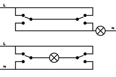 Keywords: Alternatieve wisselschakeling.svg en Alternative ways to switch a lamp from two places nl Alternatieve verboden manieren om een wisselschakeling aan te leggen own Handige Harrie 2010-07-15 3-way light switch diagrams