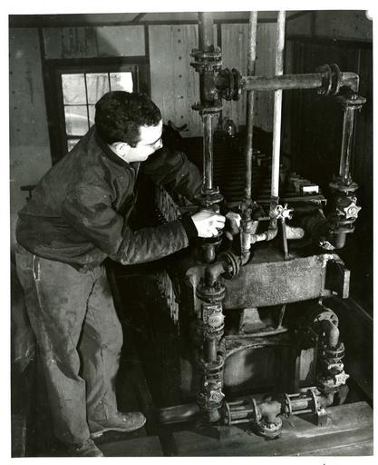 Keywords: AluminumFromClay 003.jpg After all soluble material in the clay has been dissolved in hydrochloric acid the insoluble material largely silica sludge is removed in the filter press above The filter cake is blown dry with compressed air and washed with water The acid filtrate and washings are then evaporated in a still to smaller volume so that less hydrochloric acid gas will be required for eventual precipitation of hte aluminim as the hydrated chloride Note the glass piping upper right used because of the corrosive effect of acid vapors on metal The hydrochloric acid process for the production of alumina from was developed at the National Bureau of Standards during the war when bauxite imports were cut off and it became necessary to utilize domestic sources of aluminum National Institute of Standards and Technology 5/1/1947 National Institute of Standards and Technology PD-USGov-NIST PD-USGov National Bureau of Standards National Institute of Standards and Technology |