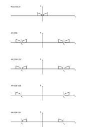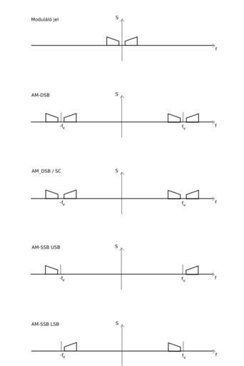 Keywords: AM spectra.svg en Spectra of different AM modulation schemes The first spectrum is that of the baseband signal hu AM modulációs típusok spektruma Az első ábra az alapsávi jel spektruma Own Kmiki87 Amplitude modulation