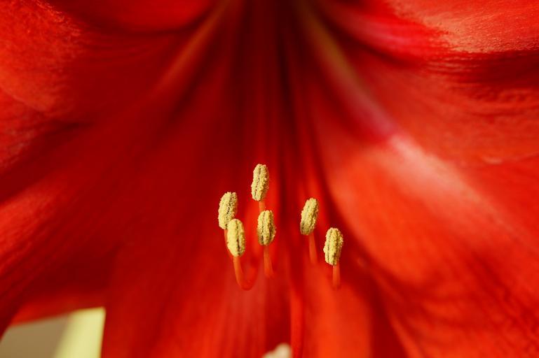 Keywords: amaryllis pistil close red blossom bloom anther pollen bee pollen macro
