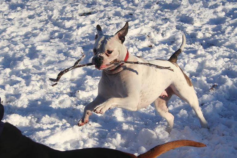 Keywords: american bulldog playing snow canine dog adorable stick pet domestic trained running