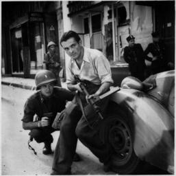 | Keywords: American officer and French partisan crouch behind an auto during a street fight in a French city. - NARA - 531322-restored.jpg American officer and French partisan crouch behind an auto during a street fight in a French city Un soldat américain et un résistant français en attente derrière une voiture durant un échange de tir dans une ville française Commons National Archives and Records Administration 1944 author PD-USGov World War II forces of the United States in France French resistance |