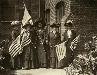| Keywords: the women's library thewomenslibrary women suffrage politics roosevelt usa hires monochrome 7JCC/O/02/077 Photograph, printed, paper, monochrome, a group of five women holding American flags; printed caption on reverse 'The United States of America will be well represented in the procession of Suffragettes which is to take place on Saturday. Our picture shows the American ladies who will carry the American flag and colours of the movement. Reading from left to right they are: Miss Julia Helen Twells, Miss E[lizabeth] Freeman (organiser of the American movement for Women's Suffrage), Miss Maude Roosevelt (niece of President Roosevelt), Professor LJ Martin of the Stanford University, California, and Miss Ada Wright', also 'Copyright World's Graphic Press Limited, 36-38 Whitefriars Street, Fleet Street, London' The women were members of the American contingent that took part in the Women's Social and Political Union’s 23 July 1910 procession. The American group was organised by Elizabeth Freeman (see Votes for Women, 22 July 1910, p 714) – and the organizer for all foreign contingents was Ada Wright. 7JCC/O/02/077 Photograph, printed, paper, monochrome, a group of five women holding American flags; printed caption on reverse 'The United States of America will be well represented in the procession of Suffragettes which is to take place on Saturday. Our picture shows the American ladies who will carry the American flag and colours of the movement. Reading from left to right they are: Miss Julia Helen Twells, Miss E[lizabeth] Freeman (organiser of the American movement for Women's Suffrage), Miss Maude Roosevelt (niece of President Roosevelt), Professor LJ Martin of the Stanford University, California, and Miss Ada Wright', also 'Copyright World's Graphic Press Limited, 36-38 Whitefriars Street, Fleet Street, London' The women were members of the American contingent that took part in the Women's Social and Political Union’s 23 July 1910 procession. The American group was organised by Elizabeth Freeman (see Votes for Women, 22 July 1910, p 714) – and the organizer for all foreign contingents was Ada Wright. |