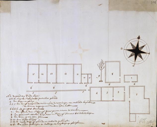 Keywords: AMH-2578-NA Floor plan for the new lodge to be built at Brotchia.jpg Artwork nl Plattegrond voor de nieuw te bouwen loge te Brotchia nl Titel catalogus Leupe NA Platte grond als voren van de Oude Logie en daarby behoord hebbende gebouwen hier wordt bedoeld de titel van VEL0876 Platte grond voor de nieuw te bouwen Logie te Brotchia van de Oude Logie en daarby behoord hebbende gebouwen Legenda 1-15 Plattegrond van de schematische indeling en omtrek van de verschillende gebouwen van de compagnie in verband met een brand met cijferaanduiding De kompasroos rechts is uitgeknipt in het centrum Rechts boven 354 Notities verso Behoort bij de papieren rakende den band Rio de la goa 1694; nr 6; 15; La Z en 499 g potlood en According to catalogue Leupe NA the original title reads Platte grond als voren van de Oude Logie en daarby behoord hebbende gebouwen referring to the title of VEL0876 Platte grond voor de nieuw te bouwen Logie te Brotchia van de Oude Logie en daarby behoord hebbende gebouwen Key 1-15 Schematic floor plan showing different rooms and the size of the various buildings belonging to the Company in connection with a fire Numbered indications The circle of the compass is cut out in the centre Top right 354 Notes on reverse Behoort bij de papieren rakende den band Rio de la goa 1694; nr 6; 15; La Z en 499 g potlood Atlas of Mutual Heritage na http //www atlasofmutualheritage nl/en/object/ id 2578 Source at the Atlas of Mutual Heritage - http //www gahetna nl/collectie/archief/inventaris/index/eadid/4 VEL/inventarisnr/877/level/file Source at the Nationaal Archief en Subjects chart / map / plan house building warehouse key compass / dial nl Onderwerpen plattegrond / kaart huis / woonhuis gebouw pakhuis legenda kompas / windroos en Post this image is related to a VOC trading post called http //www atlasofmutualheritage nl/en/post/ id 623 Bharuch Inscription - nl circa 1699 nl Anoniem / Anonymous en Anoniem / Anonymous Institution Nationaal Archief nl pen op papier en pen on paper Size cm 36 7 45 2 accession number NL-HaNA_4 VEL_877 old number VEL0877 PD-Art-100 Maps of the Dutch East India Company - India 1699 |