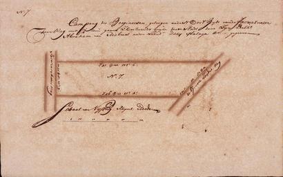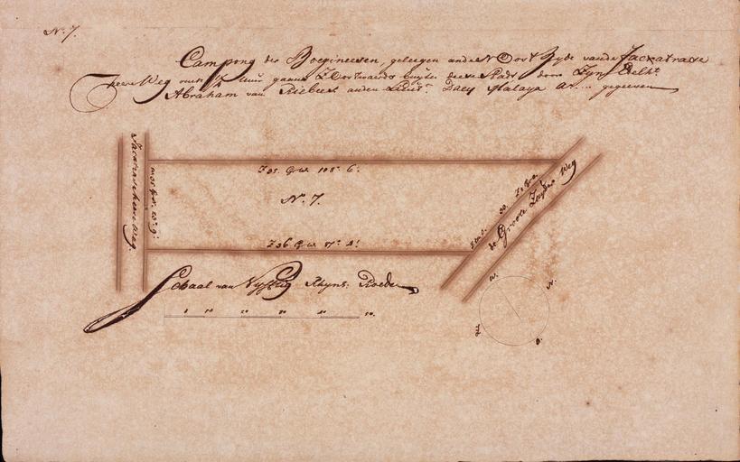 | Keywords: AMH-6042-NA Map of farmlands in the Batavia area, part seven.jpg Artwork nl Kaart van landerijen in de omgeving van Batavia deel zeven nl Titel catalogus Leupe NA Campong der Boegineesen geleegen an de noordoostzijde van de Jacatrase heereweg omtrent 1/4 uur zuijdoostwaarts buijten deese stadt door Z E Abraham van Ribeek an den leiut Daeij Malaija a gegeeven Het kaartje maakt deel uit van een verzameling van 24 kaartjes en is genummerd no 7 linksboven en in het midden N 7 De nummers 11 20 21 en 26 ontbreken Rechtsonder een compas Z;W;N;O en schaalverdeling Schaal van Vijftig Rhijns Roeden In het midden een plattegrond van wegen en grachten zoals de Groote Zuyder weg de Jacatrase heereweg en Title in the Leupe catalogue NA Campong der Boegineesen geleegen an de noordoostzijde van de Jacatrase heereweg omtrent 1/4 uur zuijdoostwaarts buijten deese stadt door Z E Abraham van Ribeek an den leiut Daeij Malaija a gegeeven The map forms part of a collection of 24 charts and is numbered no 7 top left and in the centre N 7 The numbers 11 20 21 and 26 are missing Bottom right a compass Z;W;N;O and scale Schaal van Vijftig Rhijns Roeden In the centre a map of roads and canals such as de Groote Zuyder weg de Jacatrase heereweg Atlas of Mutual Heritage na http //www atlasofmutualheritage nl/en/object/ id 6042 Source at the Atlas of Mutual Heritage - http //www gahetna nl/collectie/archief/inventaris/index/eadid/4 VELH/inventarisnr/452 7/level/file Source at the Nationaal Archief en Subjects chart / map / plan compass / dial bridge estate / plantation nl Onderwerpen plattegrond / kaart kompas / windroos brug landerij / plantage en Post this image is related to a VOC trading post called http //www atlasofmutualheritage nl/en/post/ id 328 Jakarta Inscription Campong der Boegineesen geleegen an de N Oost Zyde van de Jacxatrase heereWeg omtrent 1/4 uur gaans Z Oostwaards buyten deese Stadt door Zyn Edelht Abraham van Riebeeck anden Lieut Daey Malaya A gegeeven nl between 1689 1709 nl Anoniem / Anonymous en Anoniem / Anonymous Institution Nationaal Archief nl pen en penseel op papier en pen and brush on paper Size cm 27 43 accession number NL-HaNA_4 VELH_452 7 old number VELH0452_7 PD-Art-100 Maps of the Dutch East India Company - Indonesia |