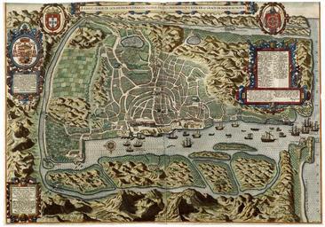 | Keywords: AMH-6577-KB Bird's eye view of the city of Goa.jpg Artwork nl Plattegrond in vogelvlucht van de stad Goa nl Plattegrond in vogelvlucht van de stad Goa A Ilhae cidade de Goa metropolitana da Indiae partes orientais que esta en 15 graos da banda do norte Er liggen enkele Portugese Oost-Indiëvaarders voor de kust Op de kade zijn olifanten bereden door mensen te zien Midden in de haven ligt een kleine omgeslagen sloep met twee mensen die er half op liggen Goa Indiae Orientalis Metropolis Emprij longe dtis pro rege Archi-episcop supremo Senalo cupletis exacta descriptio Auctor Iohannes Hugonius A linschoten 1595 Affconterfeytinge van princepaele Coop en hooft Stat des Rycks Goa alwaer die Aertsbischop Viceroy en oppersten Raet van Portugaels Indijen Resideert door Ian Huijge van Linschoten A o 1595 Verclaeringe van sommige Portugeesche woorden vande vornaemste plaetsen vande stat en t' eylant Goa Benesteri ou paßo de satiago / Benes tery ofte de paßagie van S Iacop Paßo seco / De drooge paßagie Paß de daugi / Paßagie van daugij Paßo de Norua / Paßagie van Norua Paßde Pangi / Paßagie van Pangijn Goa velha / Out Goa Cazas do Vizorey / De Huysingen van Vizeroy Cazas do Arcebispo / De Huysinge van Aertsbischop A Camara / Stat Huys Os Contos / Des Conincx Reekenkamer Alfandegea / Tolhuys O Pezo / De Waech Asouge / De Hal Tronco / t' Gevangenhuys O Terrereiro / t' Coornhuys A Moeda / De Munte Banganin / De fonteyn alsoo genaemt Pannelin / t' Speelhuys ofte lusthoff van Aertsbischop Pilourinho velho e novo / d'Oude en nieuwe Caecke Bazar grande / d' Groote vismerckt Bangasal / De plaets daermen t'barnhout vercoopt Vazar o de S Fran co / De cleyne merckt van S Fran co Ribeira das gales / De timmerwerven van galleijen Ribeira grande / De groote Conincx timmerwerven Cava / Dat zijn de oude grach van eerste stat geweest Alagoa / t Lack Leilao / Den wijtrop ofte daer men de daegelickse boerse hout Vargeas de batte / De ackerwerven van Rys A surgideira das naos do Reyno / De reede van Portugaelsche scheepen Costa brava da Ylha de Goa / De rudsige custe vant Eylant Goa Praya de Bardes de Marem fora / De strant van Bardes aen over van Zee Champanas e cotias dos gentios / De Champanen en Cottrijen van heydenen Alwaer terreiro oft terr o staet is een plaets gseyt en datter by staet is den naem van plaets Hetruscis urbem tectis quce certet et uno Spectare intuitu vis Orientis opes Imos Goa licet nostro semotior orbe Una tibi sensus expleat atque oculos Seu fora se spectes plateas seu templa Deor Obuia maiestas par et ubique nitor Aspice quam prono subductae littore puppes Quamque iter emensae fida rati statio Haud alia emporio locupletior Indus Eoi Ditia quam late dividit arva soli PHoogerbeets monogram Serniss o Principi Alberto ab Astria sacro sanctae Apost ce se dis Card Tit Sanctae Crucis in Ieusalem et Legato per Hispanias ala tere Lusitaniae et Algerbiorum pro-regi Hispaniae que Catho Ma tis nomine gubernatori Archiduci Austriae duci Burgundiae comiti Tyrolis etcr Dno suo clementis simo Iohannis Hugonius a Lynsco ten humillime dedic Inclyte avis Princeps prudenti a pectore maior Obsequy patere hoc symbolo esse mei Cf Koninklijke Bibliotheek inv nr 189 A 6 deel I voor p 71 en Bird's eye view of the city of Goa A Ilhae cidade de Goa metropolitana da Indiae partes orientais que esta en 15 graos da banda do norte There are several Portuguese East Indiamen lying off the coast People astride elephants are depicted on the quay In the centre of the harbour is a capsized sloop with two people clinging on Goa Indiae Orientalis Metropolis Emprij longe dtis pro rege Archi-episcop supremo Senalo cupletis exacta descriptio Auctor Iohannes Hugonius A linschoten 1595 Affconterfeytinge van princepaele Coop en hooft Stat des Rycks Goa alwaer die Aertsbischop Viceroy en oppersten Raet van Portugaels Indijen Resideert door Ian Huijge van Linschoten A o 1595 Verclaeringe van sommige Portugeesche woorden vande vornaemste plaetsen vande stat en t' eylant Goa Benesteri ou paßo de satiago / Benes tery ofte de paßagie van S Iacop Paßo seco / De drooge paßagie Paß de daugi / Paßagie van daugij Paßo de Norua / Paßagie van Norua Paßde Pangi / Paßagie van Pangijn Goa velha / Out Goa Cazas do Vizorey / De Huysingen van Vizeroy Cazas do Arcebispo / De Huysinge van Aertsbischop A Camara / Stat Huys Os Contos / Des Conincx Reekenkamer Alfandegea / Tolhuys O Pezo / De Waech Asouge / De Hal Tronco / t' Gevangenhuys O Terrereiro / t' Coornhuys A Moeda / De Munte Banganin / De fonteyn alsoo genaemt Pannelin / t' Speelhuys ofte lusthoff van Aertsbischop Pilourinho velho e novo / d'Oude en nieuwe Caecke Bazar grande / d' Groote vismerckt Bangasal / De plaets daermen t'barnhout vercoopt Vazar o de S Fran co / De cleyne merckt van S Fran co Ribeira das gales / De timmerwerven van galleijen Ribeira grande / De groote Conincx timmerwerven Cava / Dat zijn de oude grach van eerste stat geweest Alagoa / t Lack Leilao / Den wijtrop ofte daer men de daegelickse boerse hout Vargeas de batte / De ackerwerven van Rys A surgideira das naos do Reyno / De reede van Portugaelsche scheepen Costa brava da Ylha de Goa / De rudsige custe vant Eylant Goa Praya de Bardes de Marem fora / De strant van Bardes aen over van Zee Champanas e cotias dos gentios / De Champanen en Cottrijen van heydenen Alwaer terreiro oft terr o staet is een plaets gseyt en datter by staet is den naem van plaets Hetruscis urbem tectis quce certet et uno Spectare intuitu vis Orientis opes Imos Goa licet nostro semotior orbe Una tibi sensus expleat atque oculos Seu fora se spectes plateas seu templa Deor Obuia maiestas par et ubique nitor Aspice quam prono subductae littore puppes Quamque iter emensae fida rati statio Haud alia emporio locupletior Indus Eoi Ditia quam late dividit arva soli PHoogerbeets monogram Serniss o Principi Alberto ab Astria sacro sanctae Apost ce se dis Card Tit Sanctae Crucis in Ieusalem et Legato per Hispanias ala tere Lusitaniae et