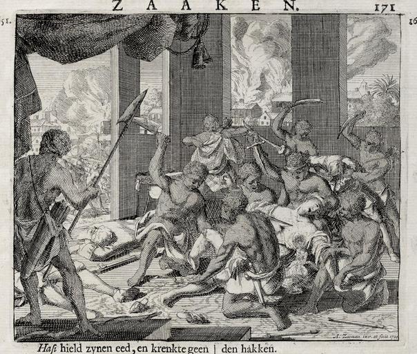 | Keywords: AMH-7215-KB Captain Verheijden's sister is being murdered.jpg Artwork nl Kapitein Verheijdens zuster wordt omgebracht nl Kapitein Verheijdens zuster wordt omgebracht Deze vrouw was getrouwd met de opperkoopman op Manipa De moord vond plaats in 1651 toen de VOC de Amboinsche oorlogen 1651-1656 met de Molukkers uitvocht De afbeelding is afkomstig uit het het werk 'Oud en Nieuw Oost-Indiën' van François Valentyn en Captain Verheijden's sister is murdered This woman was married to the senior merchant on Manipa The murder occurred in 1651 when the VOC was engaged in the Amboinese wars 1651-1656 against the Moluccans The image comes from the work 'Oud en Nieuw Oost-Indien' by Francois Valentyn Atlas of Mutual Heritage kb http //www atlasofmutualheritage nl/en/object/ id 7215 Source at the Atlas of Mutual Heritage en Subjects survey / view battle / taking / war fight house building interior Person Asians Africans European nl Onderwerpen overzicht / aanzicht veldslag / oorlog strijd / inname huis / woonhuis gebouw interieur Persoon Aziaten Afrikanen Europeanen 1724 Creator A Zeeman Creator J van Braam Creator Gerard onder de Linden nl A Zeeman graveur / etser J van Braam uitgever Gerard onder de Linden uitgever en A Zeeman engraver / etcher J van Braam publisher Gerard onder de Linden publisher Institution Koninklijke Bibliotheek nl gravure op papier en engraving on paper Size cm 13 15 accession number 185 A 5 deel II II p 171 PD-Art-100 Dutch East India Company 1724 |