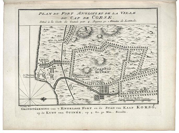 | Keywords: AMH-8061-KB Map of Cape Corso with the British fort.jpg Artwork nl Plattegrond van Caap Corso met het Engelse fort nl Plattegrond van Caap Corso met het Engelse fort Plan du Fort Anglois et de la Ville du Cap de Corse / Situé à la Coste de Guinée par 4 Degres 50 Minutes de Latitude Het fort op de plattegrond is voor het in 1664 in Engelse handen kwam door de WIC bezet geweest en Map of Cape Corso with the British fort Plan du Fort Anglois et de la Ville du Cap de Corse / Situé à la Coste de Guinée par 4 Degres 50 Minutes de Latitude The fort shown on the map was occupied by the WIC before it fell into English hands in 1664 Atlas of Mutual Heritage kb http //www atlasofmutualheritage nl/en/object/ id 8061 Source at the Atlas of Mutual Heritage en Subjects compass / dial chart / map / plan fortification tower garden / ornamental garden nl Onderwerpen kompas / windroos plattegrond / kaart vesting toren tuin / siertuin en Post this image is related to a WIC trading post called http //www atlasofmutualheritage nl/en/post/ id 688 Cape Coast Inscription Plan du Fort Anglois et de la Ville du Cap de Corse author J v Schley direx nl 1747 Creator Pierre d' Hondt Creator Jacobus van der Schley nl Pierre d' Hondt uitgever Jacobus van der Schley graveur / etser en Pierre d' Hondt publisher Jacobus van der Schley engraver / etcher Institution Koninklijke Bibliotheek nl gravure op papier en engraving on paper Size cm 14 19 accession number 693 C 6 dl V to p 134 PD-Art-100 Maps of the West-Indische Compagnie 1747 |