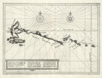 | Keywords: AMH-8127-KB Map of New Guinea and Gilolo.jpg Artwork nl Kaart van Nieuw Guinea en Gilolo nl Kaart van Nieuw Guinea en Gilolo Caerte vande Landen vande Papouas ofte Nova Guinea nae de beseijlinge en ontdecking van Iacob le Maire gedaen in den Iare 1616 De reis van Schouten en Le Maire werd in 1615 uitgerust door de vader van Le Maire voor de Australische Compagnie Deze compagnie probeerde het octrooi van de VOC te omzeilen door een andere route naar Indonesiƫ te vinden Dit lukte Schouten en Le Maire door om Vuurland heen te zeilen in plaats van door de straat Magelaen Ondanks hun ontdekkingen was hun reis niet erg succesvol eenmaal in Batavia werden ze niet geloofd en het overgebleven schip de Eendracht werd met lading in beslag genomen Schouten en Le Maire ontdekten de Willem Schouten Eilanden ten noorden van Nieuw Guinea Op de kaart is de route van Schouten en Le Maire ingetekend Cf Universiteitsbibliotheek Amsterdam inv nr OK 80 647 na p 169 en Map of New Guinea and Gilolo Caerte vande Landen vande Papouas ofte Nova Guinea nae de beseijlinge en ontdecking van Iacob le Maire gedaen in den Iare 1616 The expedition undertaken by Schouten and Le Maire was equipped in 1615 by Le Maire's father for the Australische Compagnie This company attempted to circumvent the VOC patent by finding another route to Indonesia Schouten and Le Maire succeeded in their quest by sailing around Vuurland instead of through the Magellan Straits But despite their discovery of a new route their expedition was not very successful When they arrived in Batavia their story was not believed and their remaining vessel the Eendracht was confiscated along with its cargo Schouten and Le Maire discovered the Willem Schouten Islands north of New Guinea This chart maps the route Schouten and Le Maire took Cf Universiteitsbibliotheek Amsterdam inv nr OK 80 647 after p 169 Atlas of Mutual Heritage kb http //www atlasofmutualheritage nl/en/object/ id 8127 Source at the Atlas of Mutual Heritage en Subjects chart / map / plan compass / dial banderole / cartouche / ornamentation nl Onderwerpen plattegrond / kaart kompas / windroos banderol / cartouche / versiering en Post this image is related to a VOC trading post called http //www atlasofmutualheritage nl/en/post/ id 651 Ternate Inscription Caerte vande Landen vande Papouas ofte Nova Guinea nae de beseijlinge en ontdecking van Iacob le Maire gedaen in den Iare 1616 nl 1616 Creator M Colijn nl Anoniem / Anonymous landmeter / kaartenmaker M Colijn uitgever en Anoniem / Anonymous land surveyor / mapmaker M Colijn publisher Institution Koninklijke Bibliotheek nl gravure op papier en engraving on paper Size cm 16 5 21 5 accession number 108 D 7 dl III na fol 72 PD-Art-100 Maps of the Dutch East India Company - Indonesia 1616 Jacob le Maire Willem Schouten |