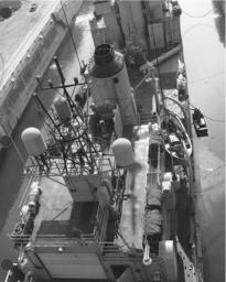 | Keywords: Amidship detail of USS Perkins (DD-877) in November 1962.jpeg View looking forward from the helicopter deck of the U S Navy destroyer USS Perkins DD-877 taken while the ship was undergoing an inclining experiment at the Long Beach Naval Shipyard California USA on 15 November 1962 at the conclusion of her FRAM II modernization Note the elaborate antenna mast fitted atop her DASH drone helicoter hangar Official U S Navy photo http //www history navy mil/our-collections/photography/numerical-list-of-images/nhhc-series/nh-series/NH-99000/NH-99526 html NH 99526 from the U S Navy http //www history navy mil Naval History and Heritage Command 1962-11-15 U S Navy PD-USGov-Military-Navy USS Perkins DD-877 Long Beach Naval Shipyard |